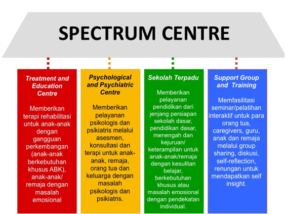 Spectrum adalah untuk orang berkebutuhan khusus yaitu anak anak, remaja dengan gangguan perkembangan, gangguan belajar dan gangguan emosional. Spectrum didirikan untuk memberikan pelayanan psikologis, rehabilitasi dan pendidikan.